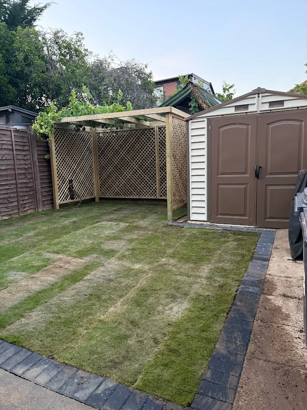 This project focuses on manicured lawns, curved paths, and garden sheds. The images showcase well-maintained gardens with stone edging, fire pits, and seating areas, along with wooden sheds in lush green garden settings.